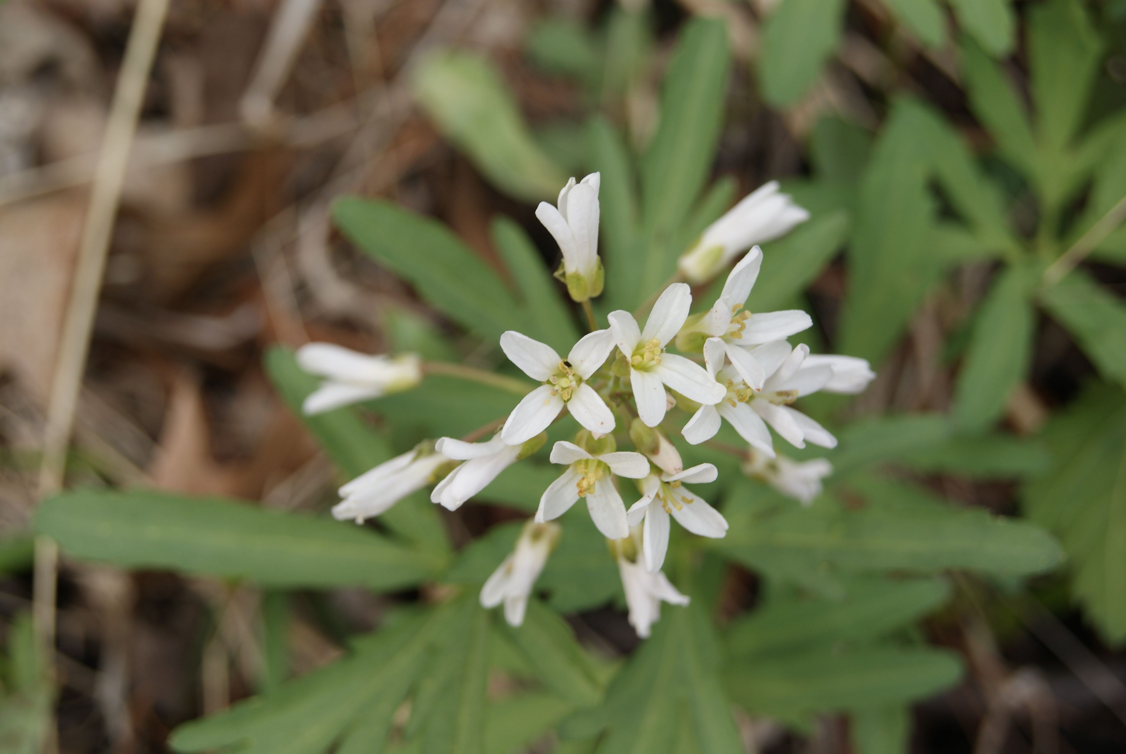 This plant I could not name last week - has white flowers with four petals. The center is yellow and the leaves have sharp edges. I found it growing on the side of a hill and up away for the wet marsh areas of the garden. After looking at several pictures in books and asking friends we decided it was a Cut-leaved Toothwort.