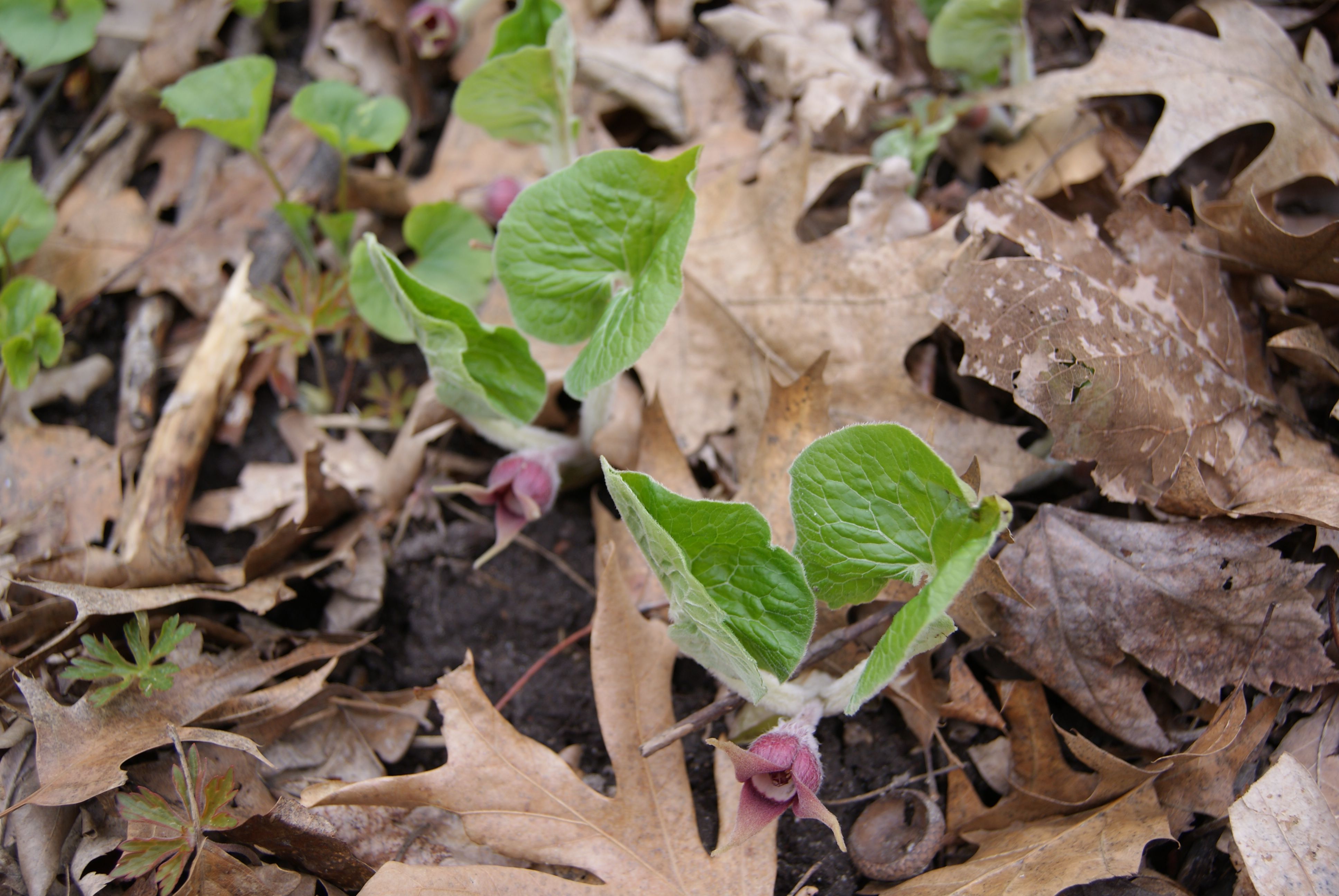 Here is the new plant I found this week. It was growing in the dry woods, has fuzzy hairs on the leaf and stem. There seems to be two or three leaves to each plant. It has a flower that is purple right at the ground where the stem is growing - not up on top of the plant like some plants I have seen. Can you name it?